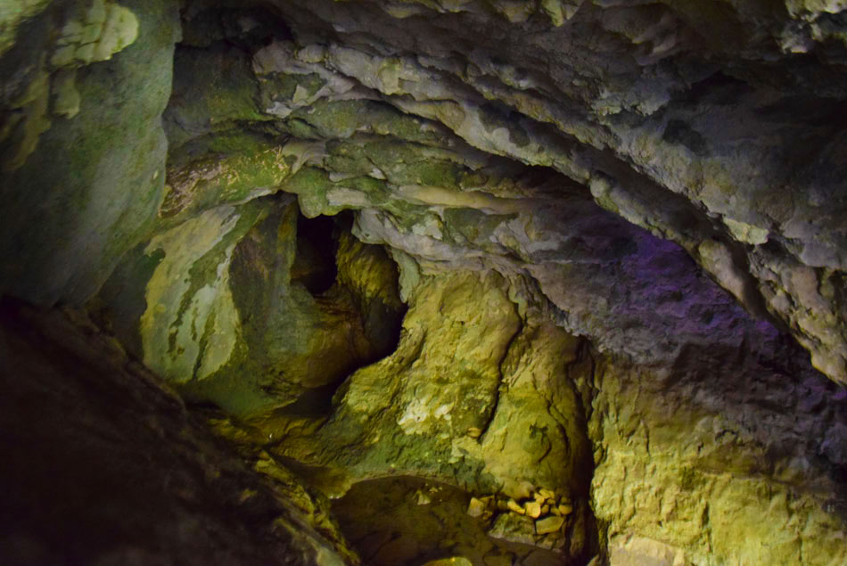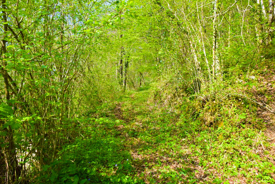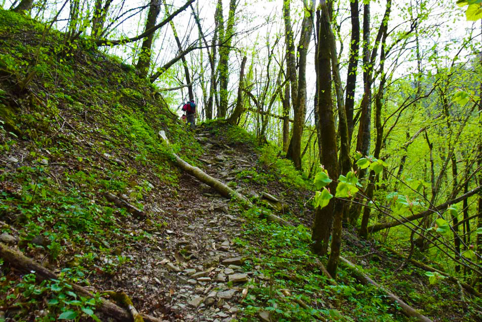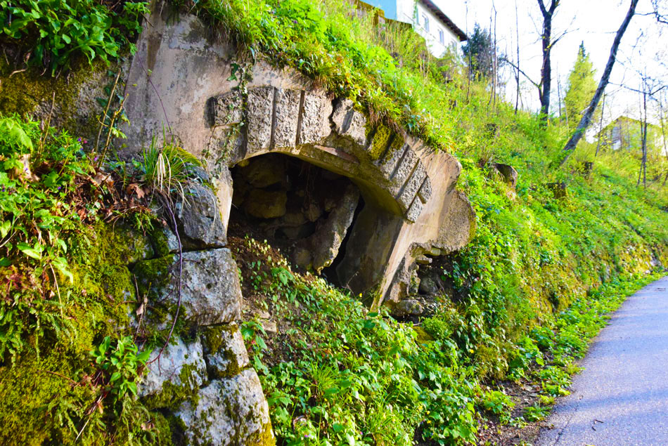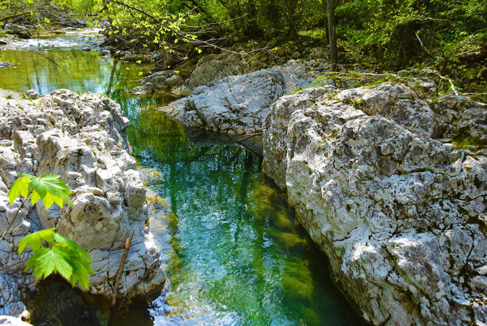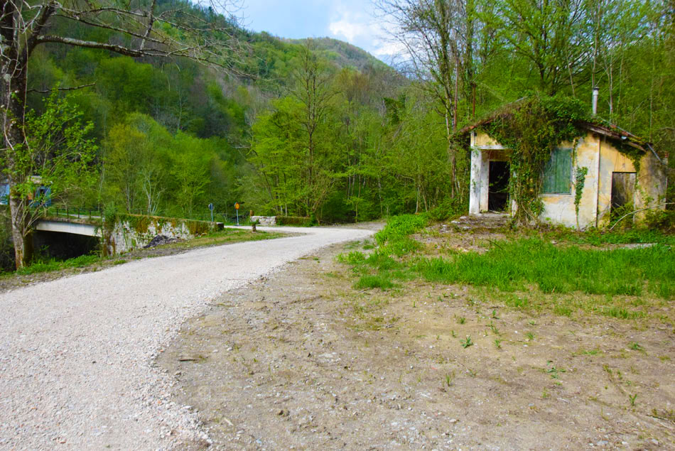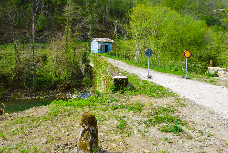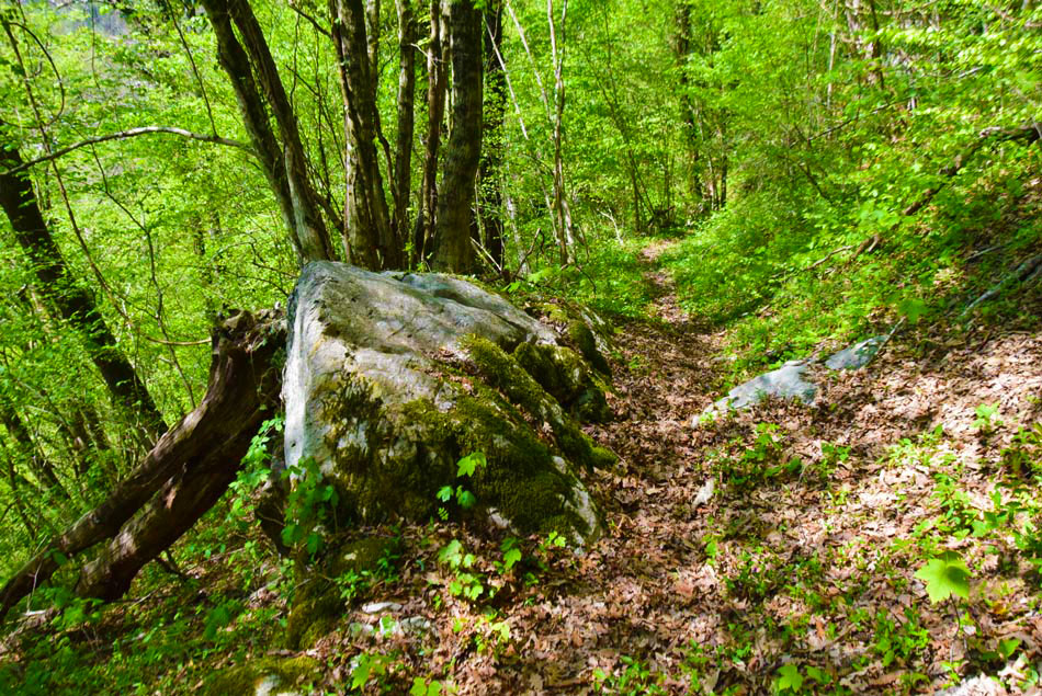 Gremo čez potok, ki se nekaj metrov navzdol ob reki izliva v Idrijo. Hodimo po neoznačeni pešpoti, ki nekaj časa sledi reki nato pa se kratko strmo vzpne, zavije levo stran od reke Idrije in se položi. Sorazmerno položna pot nato v desnem ovinku prečka hudourniško strugo ter se hitro za tem povzpnemo do široke makadamske ceste. Tu nadaljujemo s hojo naravnost navzdol po cesti. Ceste se držimo vse do reke Idrije in maloobmejnega prehoda. Za začetku zadnjega ovinka pred mostom bomo levo na drevesu opazili modro sprey oznako. Tu gremo naravnost po kolovozu. Položna pot nas v nadaljevanju vodi mimo geološkega preloma, visoke navpične stene, kjer je bila med prvo svetovno vojno vojaška bolnišnica. Njene ostanke, npr. betonske stopnice ob kolovozu, lahko še vedno opazimo. Struga reke Idrije, nekaj metrov desno od nas, je na tem mestu izdolbla manjše korito z nekaj tolmuni. Tu se še naprej držimo našega kolovoza, ki nas večinoma vodi ob Idriji. Ko v nadaljevanju prečkamo strugo majhnega potočka, ki je večino leta suha, smo pozorni na modre sledi, ki nas vodijo levo v breg (od tu naprej utegne biti opisana pot precej zaraščena in težje prehodna, modre sledi pa slabše vidne). Modre oznake nas po morda 30 metrih hoje v breg pripeljejo do vhoda v kraško izvirno jamo iz katere teče hudourniški potok. Vanjo lahko stopimo nekaj metrov globoko. Nato se vrnemo do kolovza in gremo levo naprej po njem. Hitro pridemo do visokih sten in brzic reke Idrije. Tu se naša pot konča.