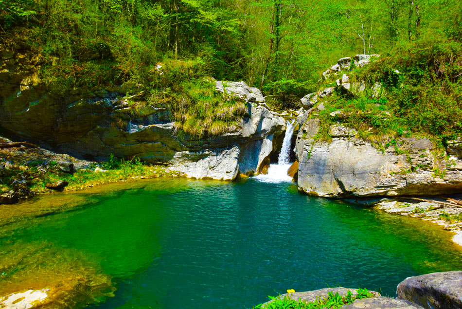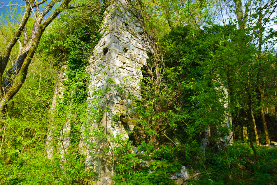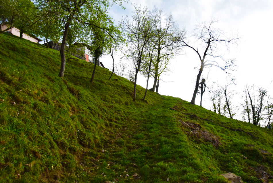 Vzpon: S hojo pričnemo po makadamski cesti navzdol. Čez približno 50 metrov na križišču se desno navzdol odcepi asfaltirana cesta, mi pa gremo naravnost navzdol. Nižje po morda 20 minutah hoje pridemo do naslednjega križišča, kjer zavijemo ostro levo navzdol - ne gremo naravnost. Sedaj sledimo tej cesti. Nižje preko manjšega mosta prečkamo potok - pritok Idrije in se še naprej držimo naše ceste, ki se je do mostu spuščala, sedaj pa se blago vzpenja. V nekaj minutah pridemo do vasi Kosi, kjer levo zavije kolovoz, ki nas vodi med slabo ohranjeno hišo in ruševino nekdanje domačije. Za ruševino zavijemo levo na neoznačeno stezo, ki nas vodi mimo več razvalin zaselka Kosi. Stezica nas vodi po grebenu mimo nizkega skalnatega roba. Ko je rob za nami smo čez nekaj metrov pozorni na razpotje neoznačenih stezic (zlahka ga spregledamo), kjer zavijemo na stezico, ki gre levo navzdol. Stezica nas sprva vodi ob približno 1.5 metra visokem kamnitem zidu in se zložno spušča. Neoznačene stezice, ki se zložno spušča, se držimo vse do reke Idrije. Pripelje nas do velikega smaragdnega tolmuna z nekaj metrov visokim slapom.